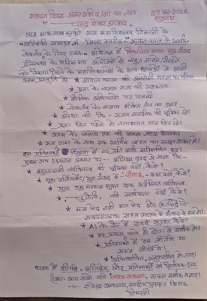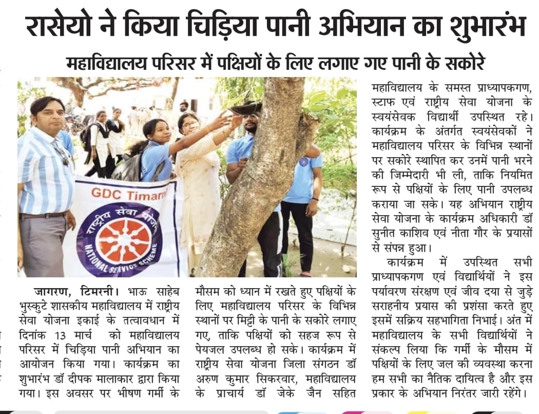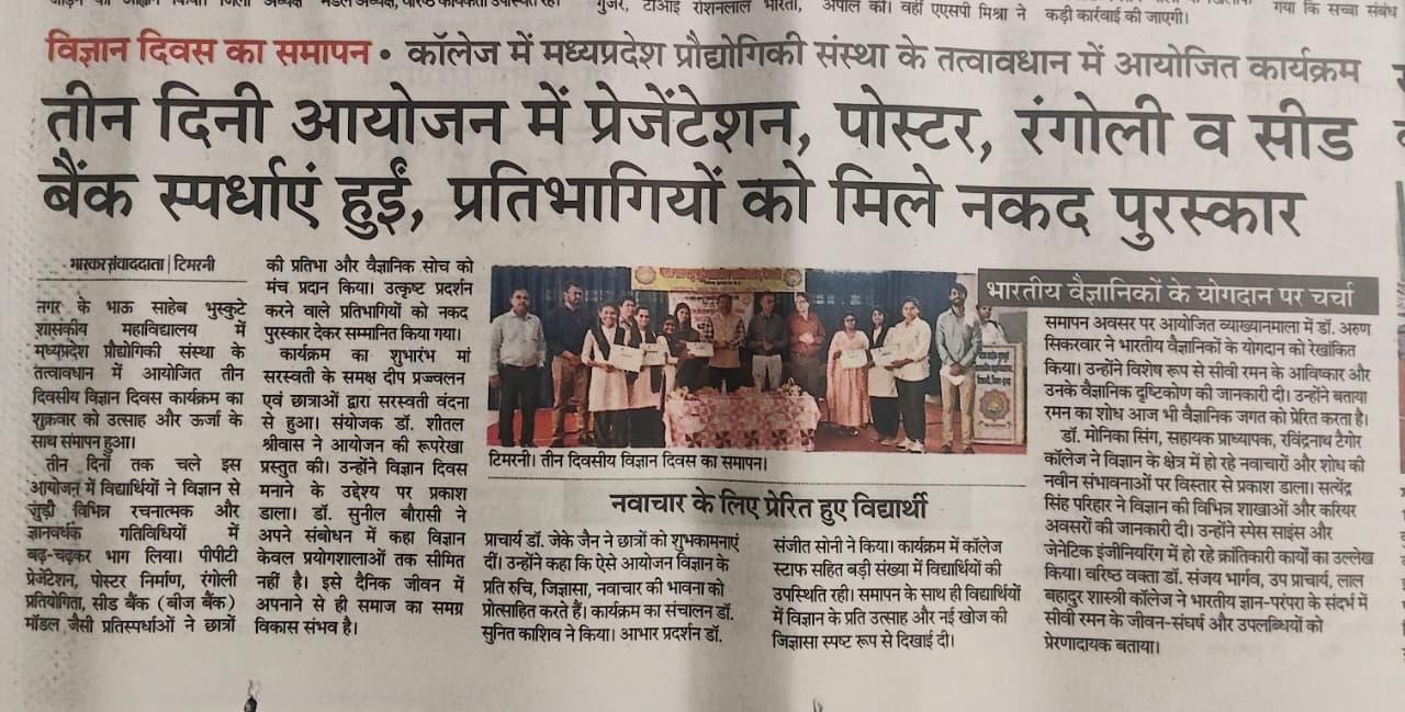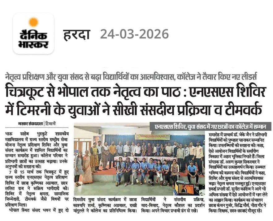 Bhau Sahabe Bhuskute Government Degree College, Timarni is recognized for its commendable services in the field of higher education. The college was established in the year 1983. It is affiliated to Barkatullah University and accredited with “B+” grade by National Assessment and Accreditation Council since 2006. In its last accreditation process in 2024, it has been credited ’B+’ grade. It is recognized by the UGC Act under sections 2f and 12B. The college is run by the government whose main motto is to “Dispel Ignorance”. It has been catering to the academic needs of the student of remote rural villages in the periphery of Timarni town. It also goes to the credit of the college that most of the girls prefer to study here in spite of existence of various private colleges. The college is situated at the national highway connecting Betul and Indore. Institute has a lush green campus spreading in 10117sq.meters which is situated in the outskirts of Timarni Town on National Highway 59A Indore-Betul Road. Institute has adequate Infrastructure and physical facilities for teaching and learning viz., classrooms, laboratories, well equipped with ICT facilities and learning resources. College has 19 regular classrooms with ICT facilities, Chemistry lab, Physics lab, Botany lab, Zoology lab , 3 Computer labs, Wi-Fi campus and CCTV cameras at different places. The college offers Nine Undergraduate Programs and Five Postgraduate Programs. The college focuses on introducing innovative practices, enhancing quality and instilling social responsibility. Regarding games and sports students of the college have participated and excelled in different games at the National, State and University Levels. The college has a library with a good number of books, major newspapers and magazines. Institute also has an e-Library and it offers remote access to library facilities through INFLIBNET. e-Library is functioning from dedicated library space, well equipped with IT Infrastructure. Library is partially automated using SOUL (E-Granthalay)version 2.0. It is user-friendly software developed to work under client-server environment. Library is Wi-Fi enabled, and remote access is provided through remote access NLIST, Shodhganga, Shodhsindhu, repository of content related to syllabus, books Newspapers and Journals.