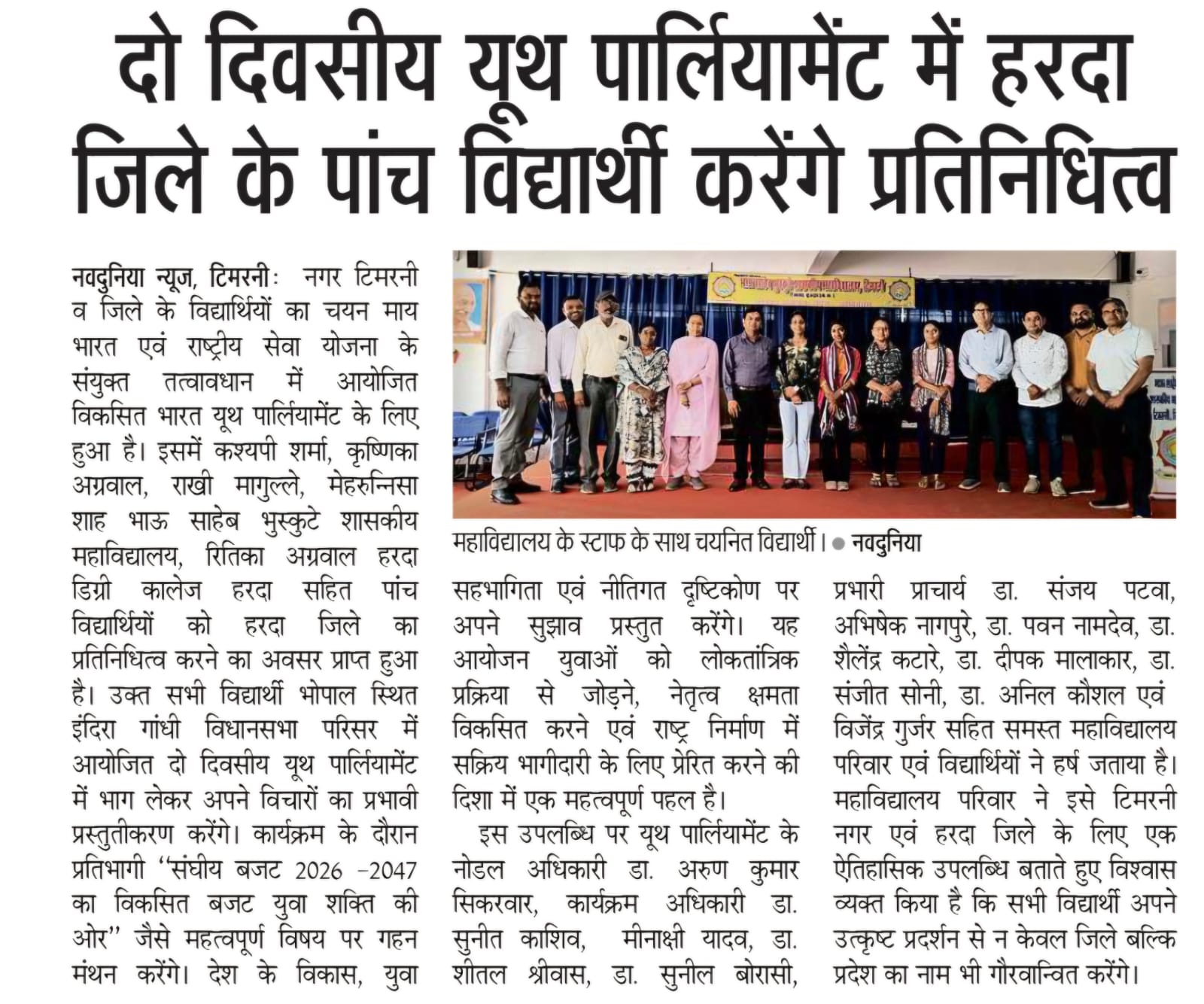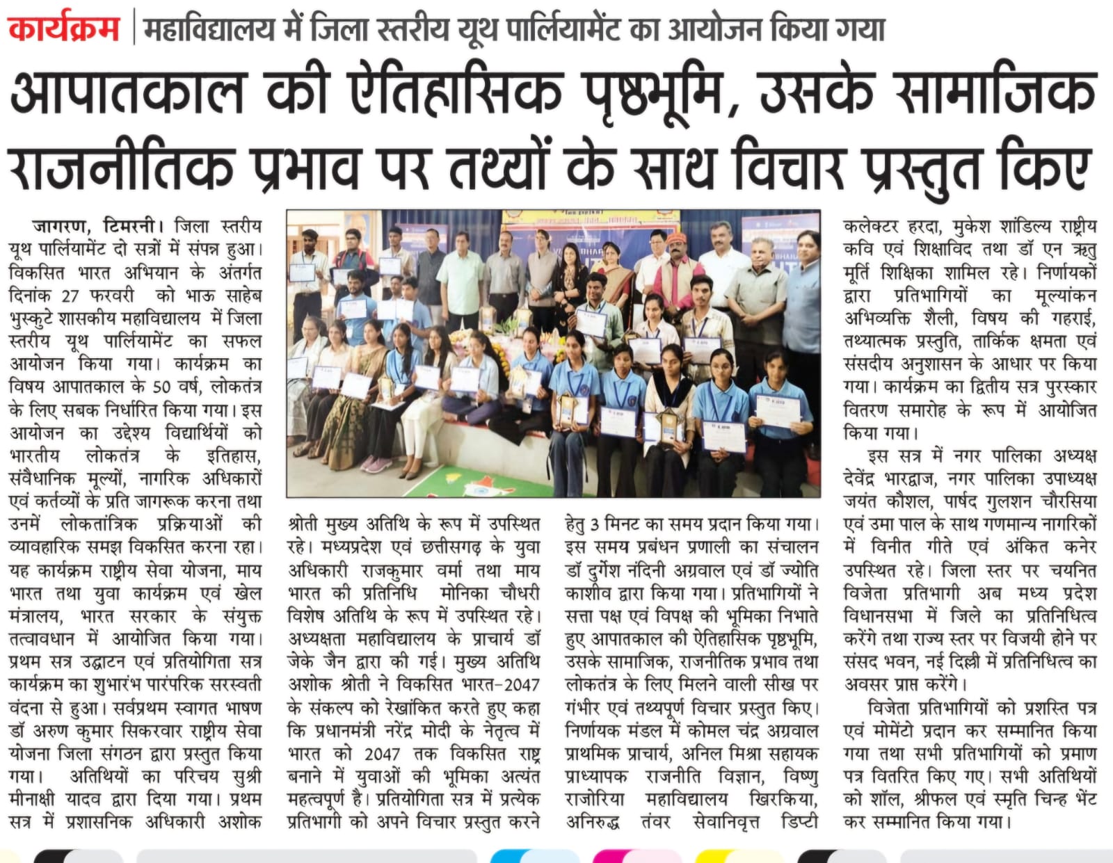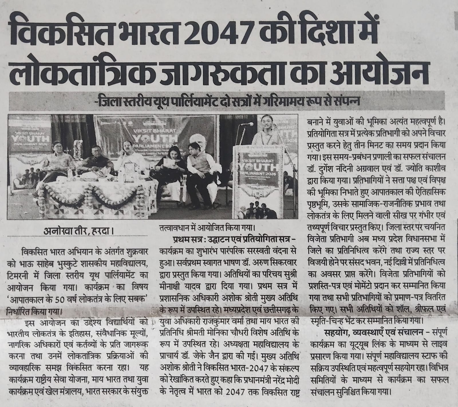 Bhau Sahabe Bhuskute Government Degree College, Timarni is recognized for its commendable services in the field of higher education. The college was established in the year 1983. It is affiliated to Barkatullah University and accredited with “B+” grade by National Assessment and Accreditation Council since 2006. In its last accreditation process in 2024, it has been credited ’B+’ grade. It is recognized by the UGC Act under sections 2f and 12B. The college is run by the government whose main motto is to “Dispel Ignorance”. It has been catering to the academic needs of the student of remote rural villages in the periphery of Timarni town. It also goes to the credit of the college that most of the girls prefer to study here in spite of existence of various private colleges. The college is situated at the national highway connecting Betul and Indore. Institute has a lush green campus spreading in 10117sq.meters which is situated in the outskirts of Timarni Town on National Highway 59A Indore-Betul Road. Institute has adequate Infrastructure and physical facilities for teaching and learning viz., classrooms, laboratories, well equipped with ICT facilities and learning resources. College has 19 regular classrooms with ICT facilities, Chemistry lab, Physics lab, Botany lab, Zoology lab , 3 Computer labs, Wi-Fi campus and CCTV cameras at different places. The college offers Nine Undergraduate Programs and Five Postgraduate Programs. The college focuses on introducing innovative practices, enhancing quality and instilling social responsibility. Regarding games and sports students of the college have participated and excelled in different games at the National, State and University Levels. The college has a library with a good number of books, major newspapers and magazines. Institute also has an e-Library and it offers remote access to library facilities through INFLIBNET. e-Library is functioning from dedicated library space, well equipped with IT Infrastructure. Library is partially automated using SOUL (E-Granthalay)version 2.0. It is user-friendly software developed to work under client-server environment. Library is Wi-Fi enabled, and remote access is provided through remote access NLIST, Shodhganga, Shodhsindhu, repository of content related to syllabus, books Newspapers and Journals.