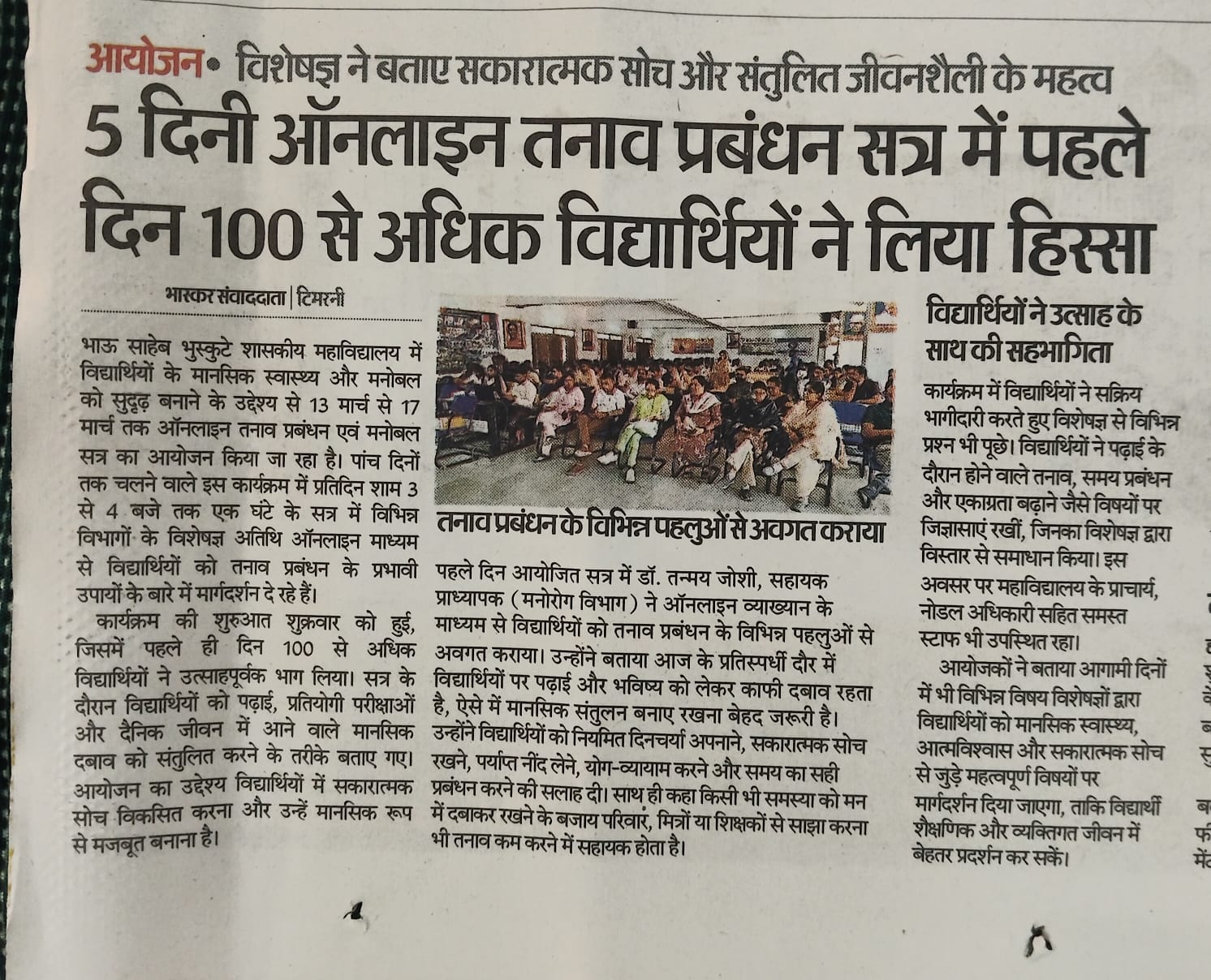 Bhau Sahabe Bhuskute Government Degree College, Timarni is recognized for its commendable services in the field of higher education. The college was established in the year 1983. It is affiliated to Barkatullah University and accredited with “B+” grade by National Assessment and Accreditation Council since 2006. In its last accreditation process in 2024, it has been credited ’B+’ grade. It is recognized by the UGC Act under sections 2f and 12B. The college is run by the government whose main motto is to “Dispel Ignorance”. It has been catering to the academic needs of the student of remote rural villages in the periphery of Timarni town. It also goes to the credit of the college that most of the girls prefer to study here in spite of existence of various private colleges. The college is situated at the national highway connecting Betul and Indore. Institute has a lush green campus spreading in 10117sq.meters which is situated in the outskirts of Timarni Town on National Highway 59A Indore-Betul Road. Institute has adequate Infrastructure and physical facilities for teaching and learning viz., classrooms, laboratories, well equipped with ICT facilities and learning resources. College has 19 regular classrooms with ICT facilities, Chemistry lab, Physics lab, Botany lab, Zoology lab , 3 Computer labs, Wi-Fi campus and CCTV cameras at different places. The college offers Nine Undergraduate Programs and Five Postgraduate Programs. The college focuses on introducing innovative practices, enhancing quality and instilling social responsibility. Regarding games and sports students of the college have participated and excelled in different games at the National, State and University Levels. The college has a library with a good number of books, major newspapers and magazines. Institute also has an e-Library and it offers remote access to library facilities through INFLIBNET. e-Library is functioning from dedicated library space, well equipped with IT Infrastructure. Library is partially automated using SOUL (E-Granthalay)version 2.0. It is user-friendly software developed to work under client-server environment. Library is Wi-Fi enabled, and remote access is provided through remote access NLIST, Shodhganga, Shodhsindhu, repository of content related to syllabus, books Newspapers and Journals.